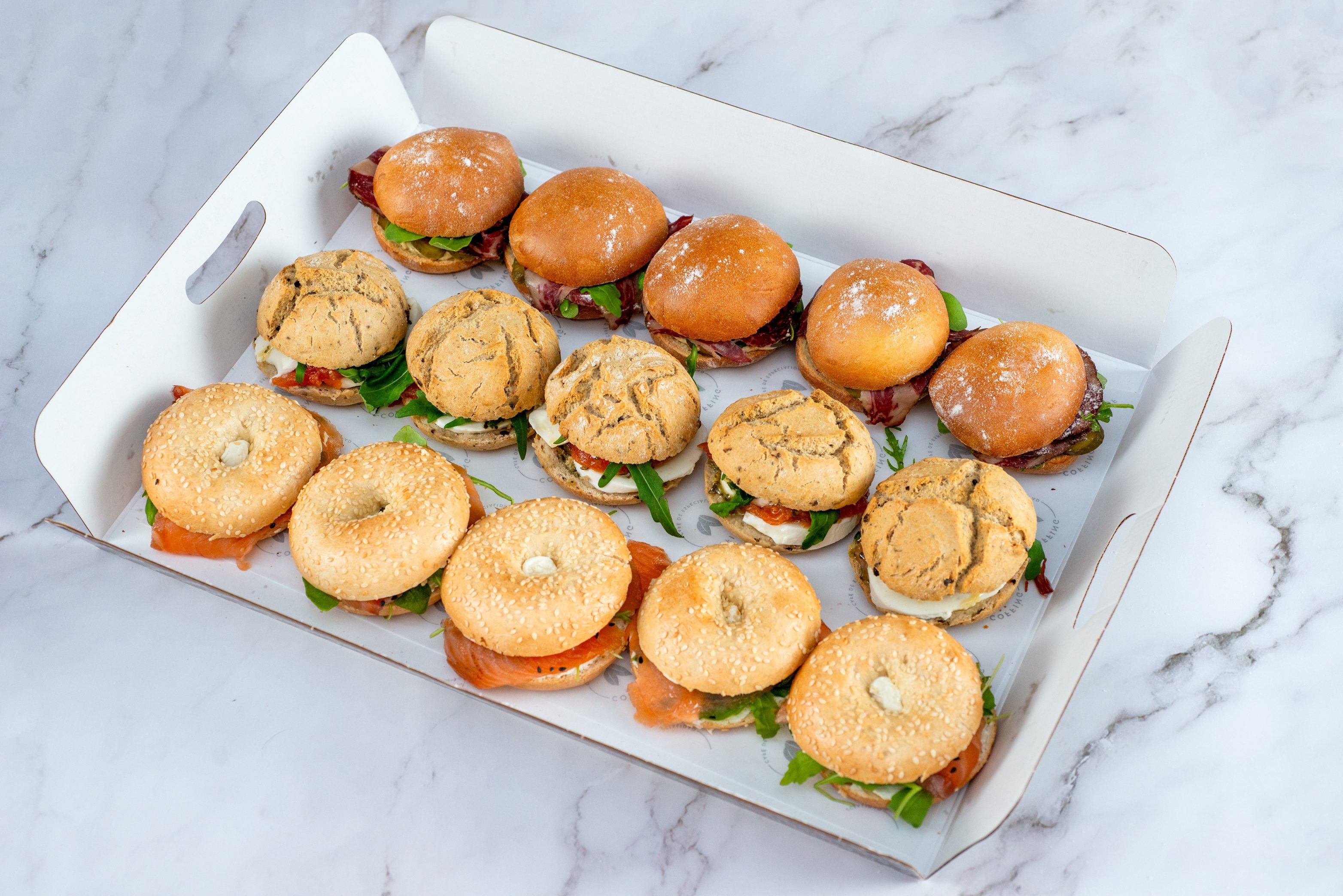 Catering en cajas-bandeja, quitas la tapa y ya tienes tu evento listo y bien presentado.